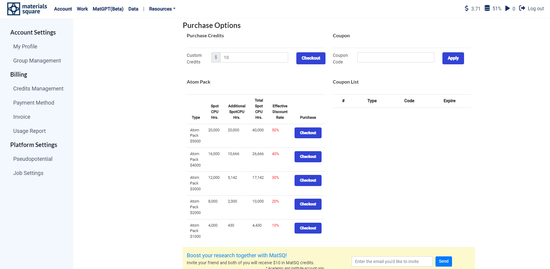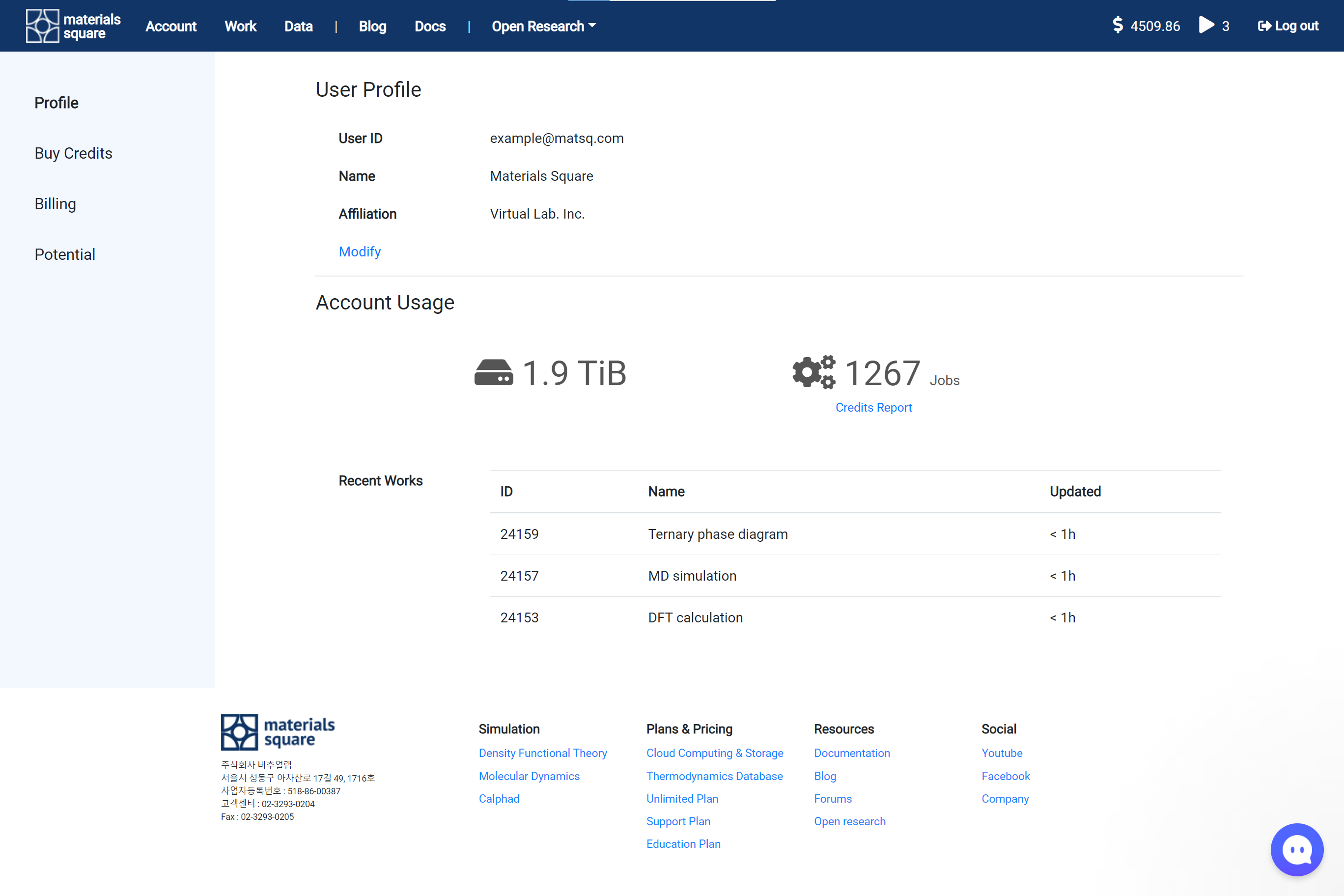 The Account page lets you modify your account information, top-up credit, view credit top-up/use history, and set default pseudopotential set.