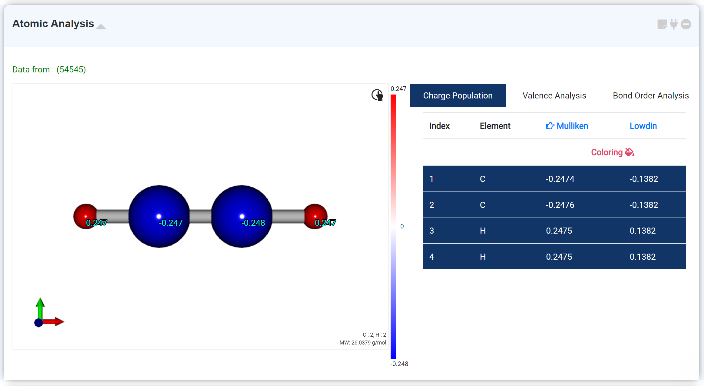 Charge Population tab shows Mulliken and Lowdin Charge. If clicking the 'Coloring ' option, the charge transfer distribution is expressed in color.