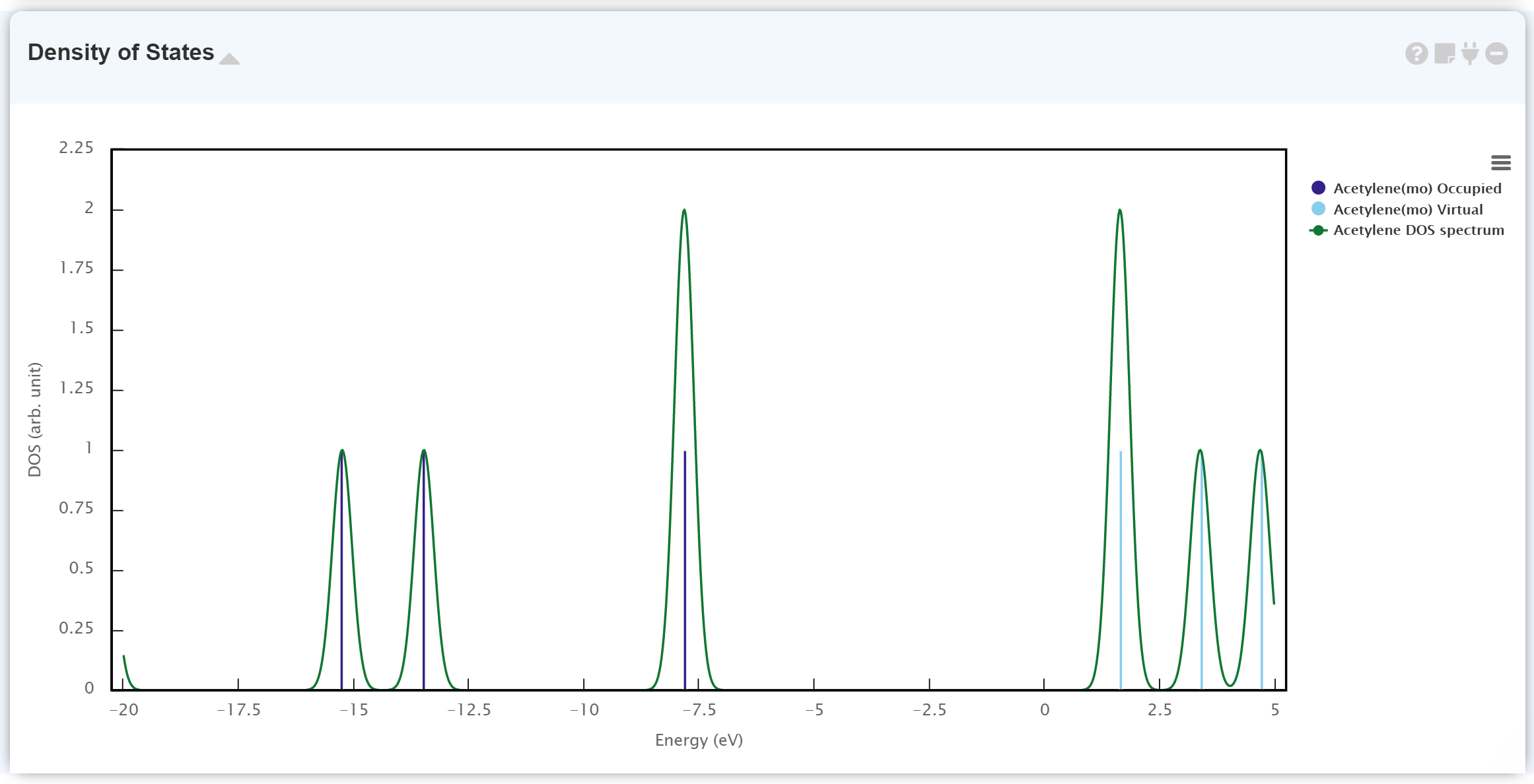 The Density of State module plots the calculated electronic status. The discontinuous graph is for MO eigenvalues; the dark-blue and light-blue lines correspond to occupied MO and virtual (unoccupied) MO, respectively. The continuous graph ([Job Name] DOS spectrum) is the Gaussian broadening data from the MO eigenvalue.