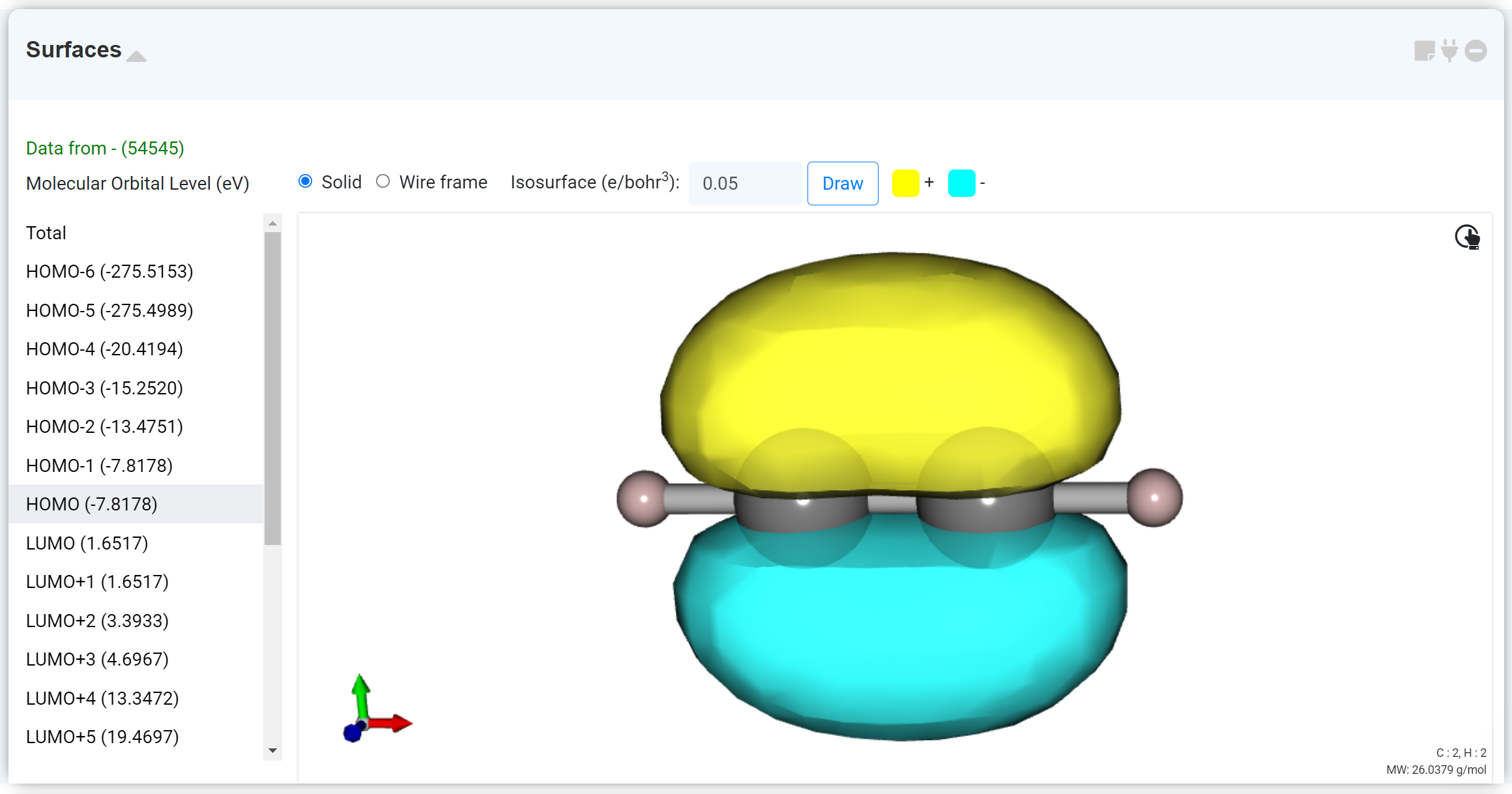 The 'Surface' module represents the calculated molecular orbital (MO) with HOMO as the default.