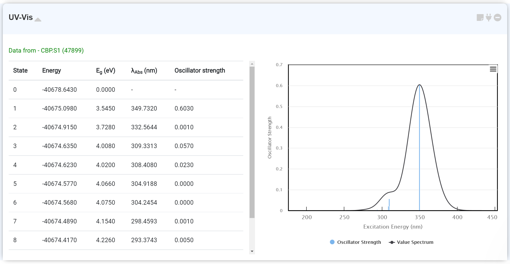 By hovering the mouse pointer on the spectrum, you can check the λAbs and Oscillator Strength.