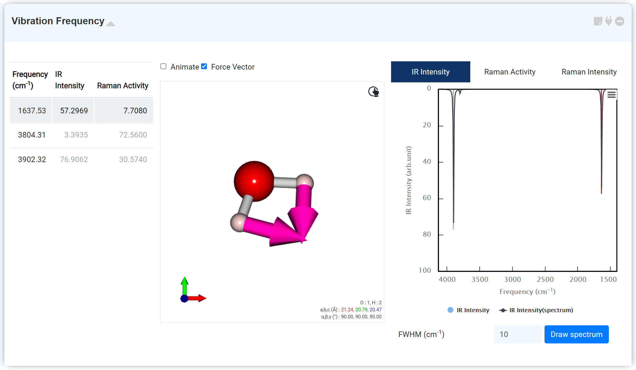 The 'Vibration Frequency' module displays the 'IR frequency' and ' Raman activity' data obtained from the GAMESS module. Within the GAMESS module, the 'IR frequency' can be obtained through the 'IR frequency option: True' of '&STATPT' when 'RUN Type: OPTIMIZE.' The 'Raman activity' can be calculated by setting 'RUN Type: RAMAN' on the new GAMESS module, which is connected to the previous module performing the hessian calculation.