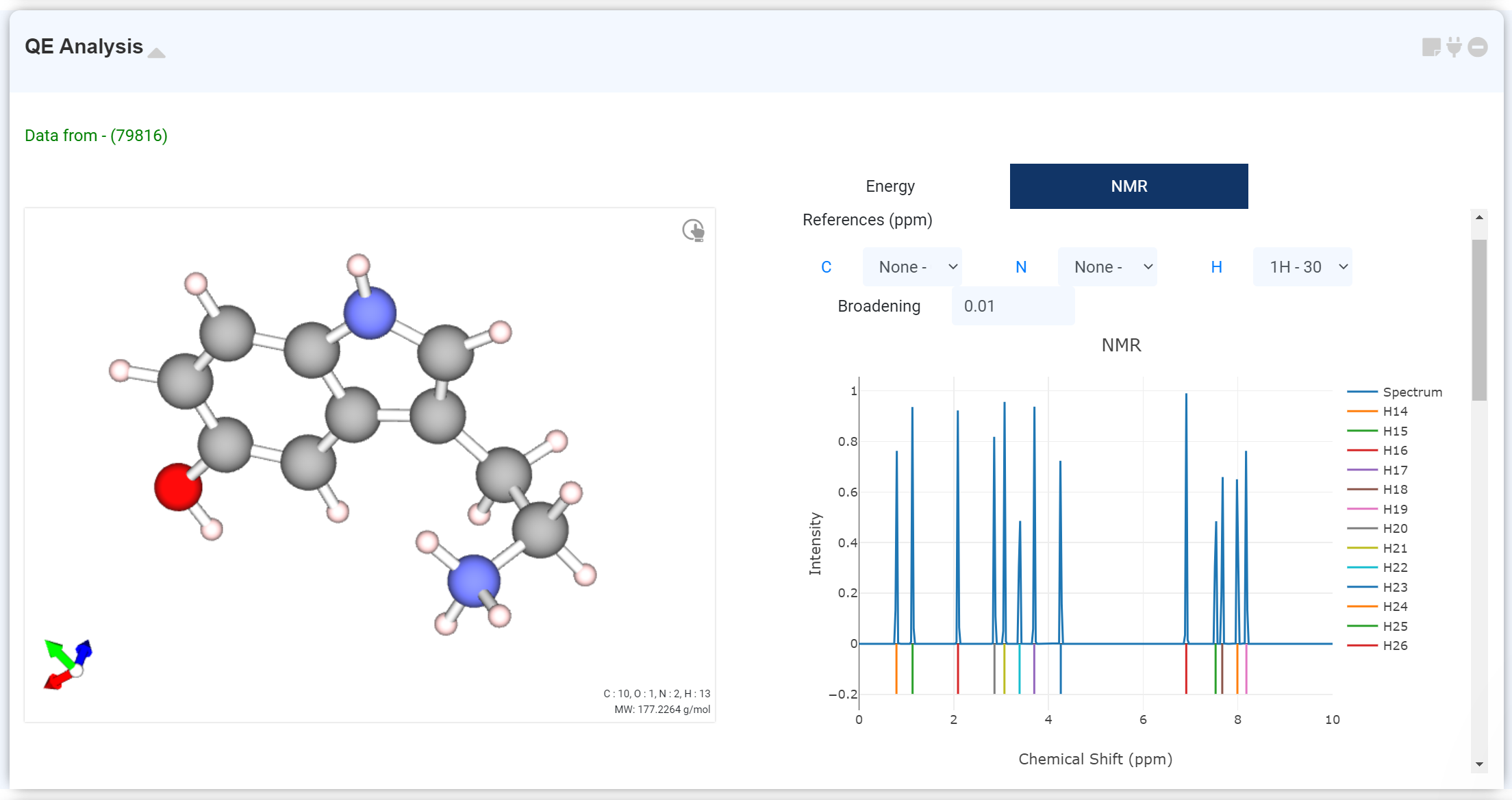 Scroll down to see a table with atoms and computed NMR data. Select the desired atoms in the table to add the corresponding values to the spectrum. Alternatively, you can click the blue element symbol link next to the to see the data for that element at once. The Select box allows you to specify a reference to compensate for the x-axis (chemical shift) values. Adjust the Spectrum shape by modifying the Broadening values.