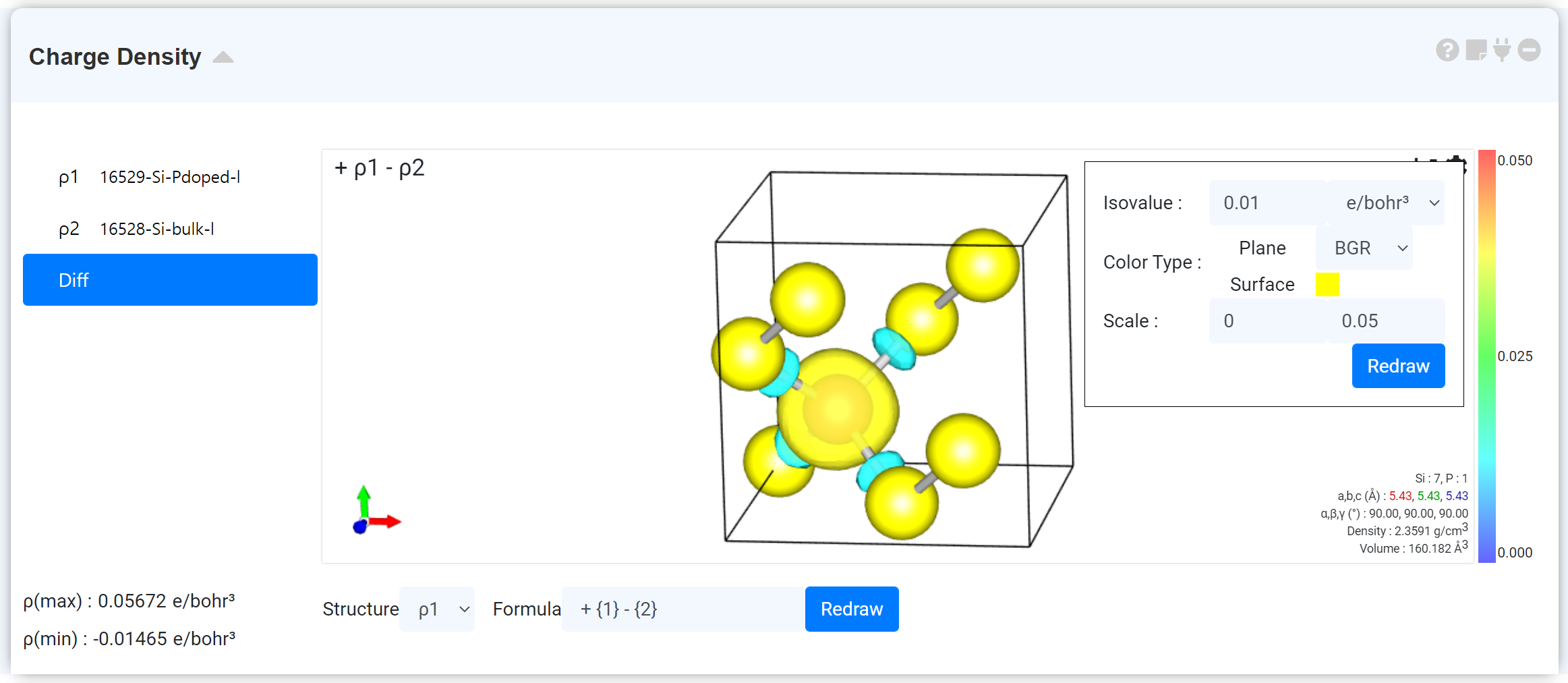 If more than one charge densities are connected, 'Diff' tab is activated with the connected charge densities in the list on the left. You can view the sum or difference of the charge density values, which were connected through Diff. Refer to the following section for more information on how to draw charge density differences. Note: “charge density” refers to an electron density by convention of DFT society. This module draws ‘pseudo charge density’ which is much smoother near atomic cores than true chare density, as Quantum Espresso uses pseudopotential.