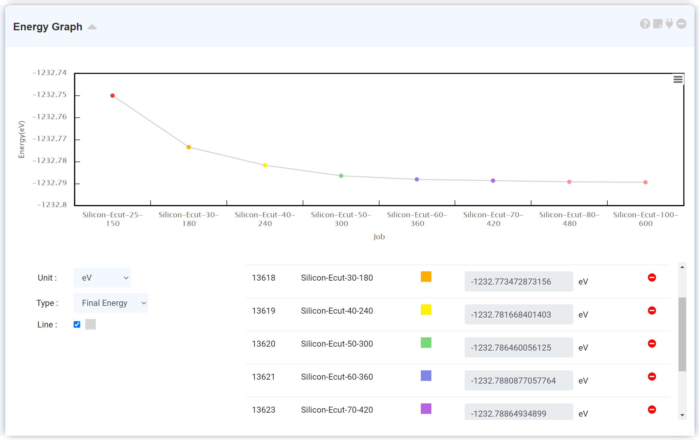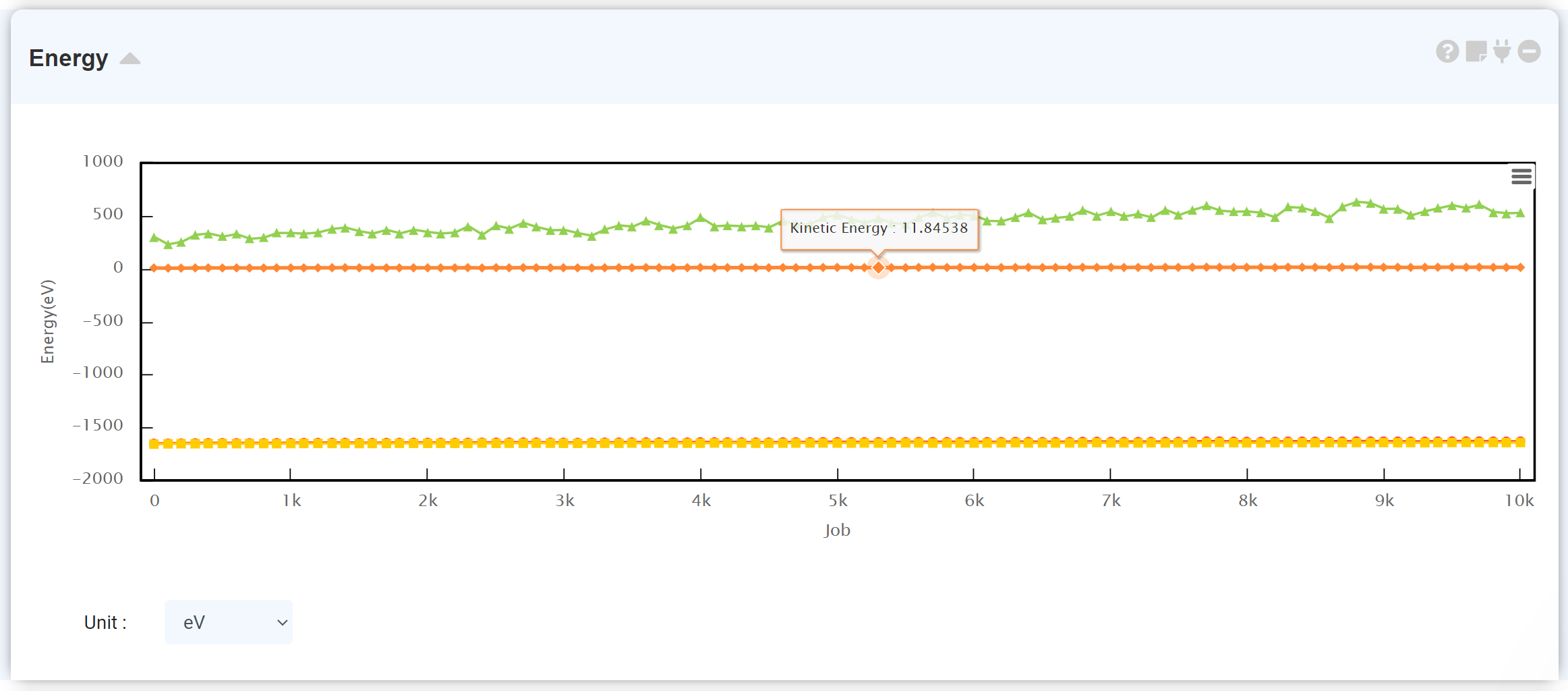 Checking the energy graph is a good way to ensure that convergence has been achieved during the structural optimization process. The calculation may not have been completed properly if the scf phase of the energy graph has reached the maximum number of scf steps even if the “This job is normal finished” message appeared in the QE module. Refer to the Restart job (Quantum Espresso) , Restart job (GAMESS) section.