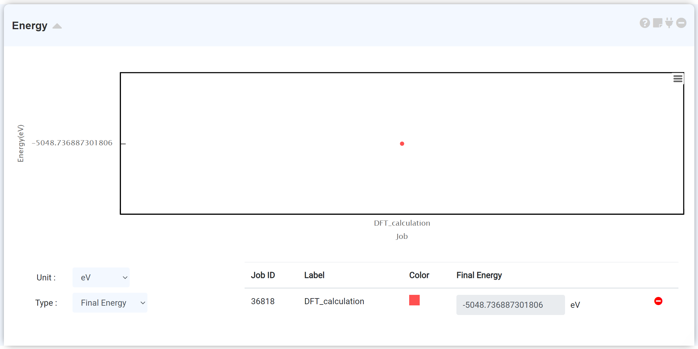 Each calculation job can consist of several scf steps, and one scf step consists of a set of iteration steps. The Energy module plots the total energy value obtained from the iterative self-consistent calculation. Therefore, for a calculation that performs a single scf calculation, there is only one data point because only one total energy data was obtained through iteration. The optimization calculation (QE: (vc-)relax, GAMESS: OPTIMIZE), which consists of several scf steps, shows the energy that gradually changing with the progress of the scf calculation.