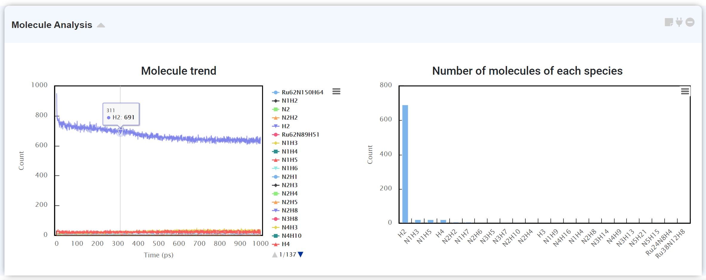 “Molecule Analysis” module counts number of atoms after molecular dynamics simulation. It displays the number of molecules existing in the system with respect to time by analyzing (left), and counting the number of atoms for the chemical species to find what molecule exists majorly at the time (right).