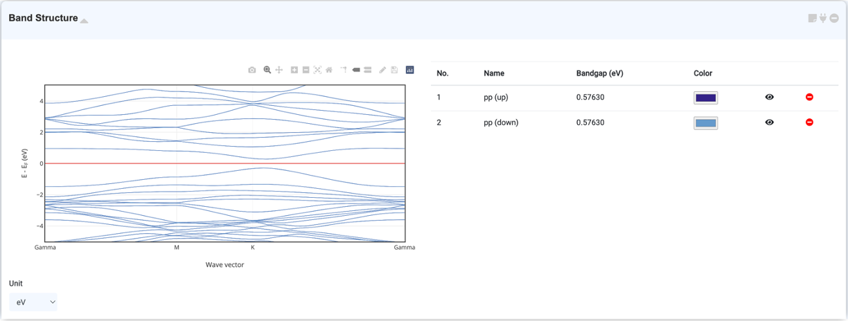 Band structure represents the energy level, or distribution, allowed for electrons in a material. The graph is represented by k vector vs energy. You can check the band structure by selecting "Band Structure" in the Analysis Module and clicking on the activated module to connect. You can zoom in, set range, download, etc. using the tools at the top.