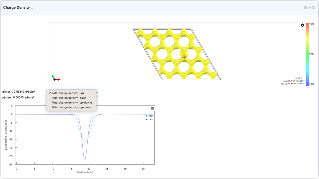 The "Charge Density" module visualizes the charge density and potential of a calculated structure by displaying surfaces (isosurfaces) and cell boundaries with equal values in space. If you select "Charge Density" in the Analysis Module and click on the activated module to connect, the charge density and potential will appear in 3D/2D format in this module. You can change charge the settings by opening the settings window through the gear button at the top right corner of the Visualizer.