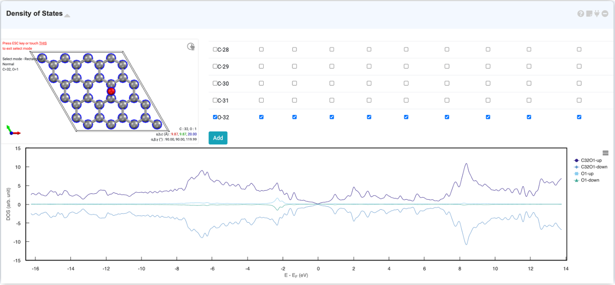 The DOS module allows you to view the projected density of states (PDOS) for specific atomic orbitals. When you select the desired atom in the visualizer in the DOS module, the orbitals of the atoms are displayed in the orbital list on the right. If you select the desired orbital and click the 'Add' button, 'PDOS' will be added.