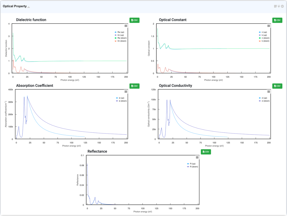 By selecting "Optical Property" in the Analysis Module and clicking on the activated module to connect, you can check the optical properties of the system graphically. You can check Dielectric function, Optical Constant (refractive index, extinction coefficient), Absorption coefficient, Optical conductivity, and Reflectance in this module.