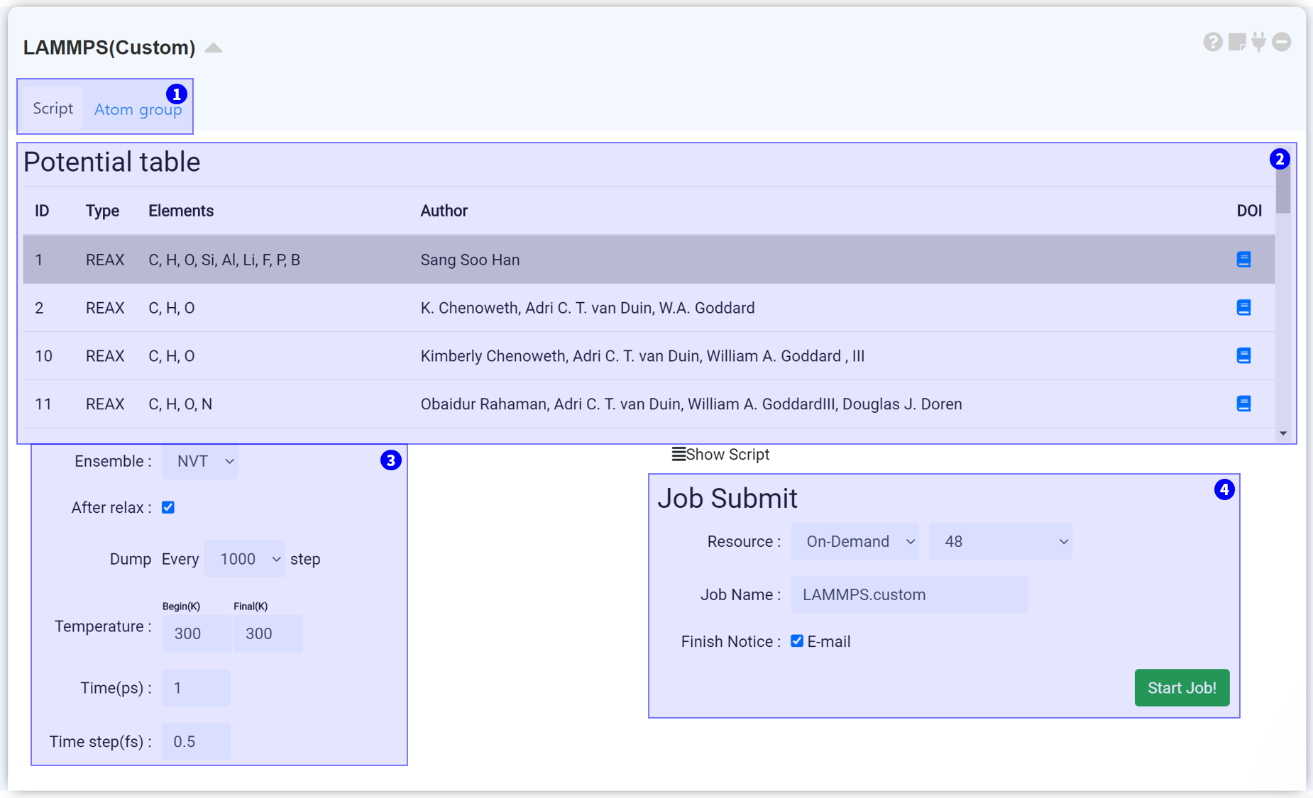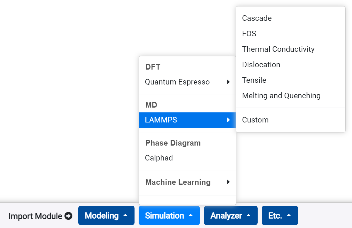 "Custom" module is for performing MD simulation which is not offered in the template. It enables perform simulation by adjusting ensemble, temperature, time. It can add options to certain atom-group by generating a group. In the present, the reactive forcefield (ReaxFF) only supported, but other types of potential will be updated soon.