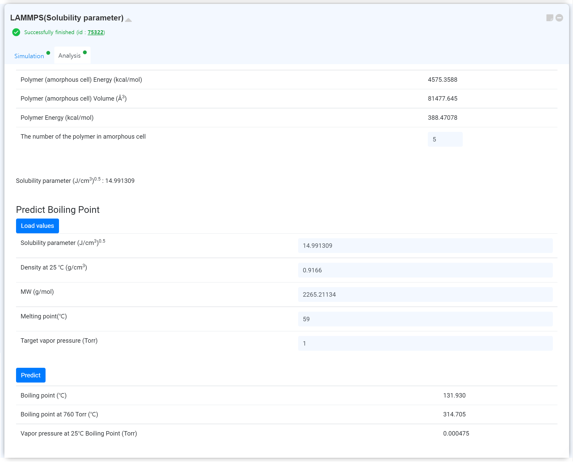 Also, you can determine the solubility parameter by changing 'The number of the polymer in amorphous cell' value.