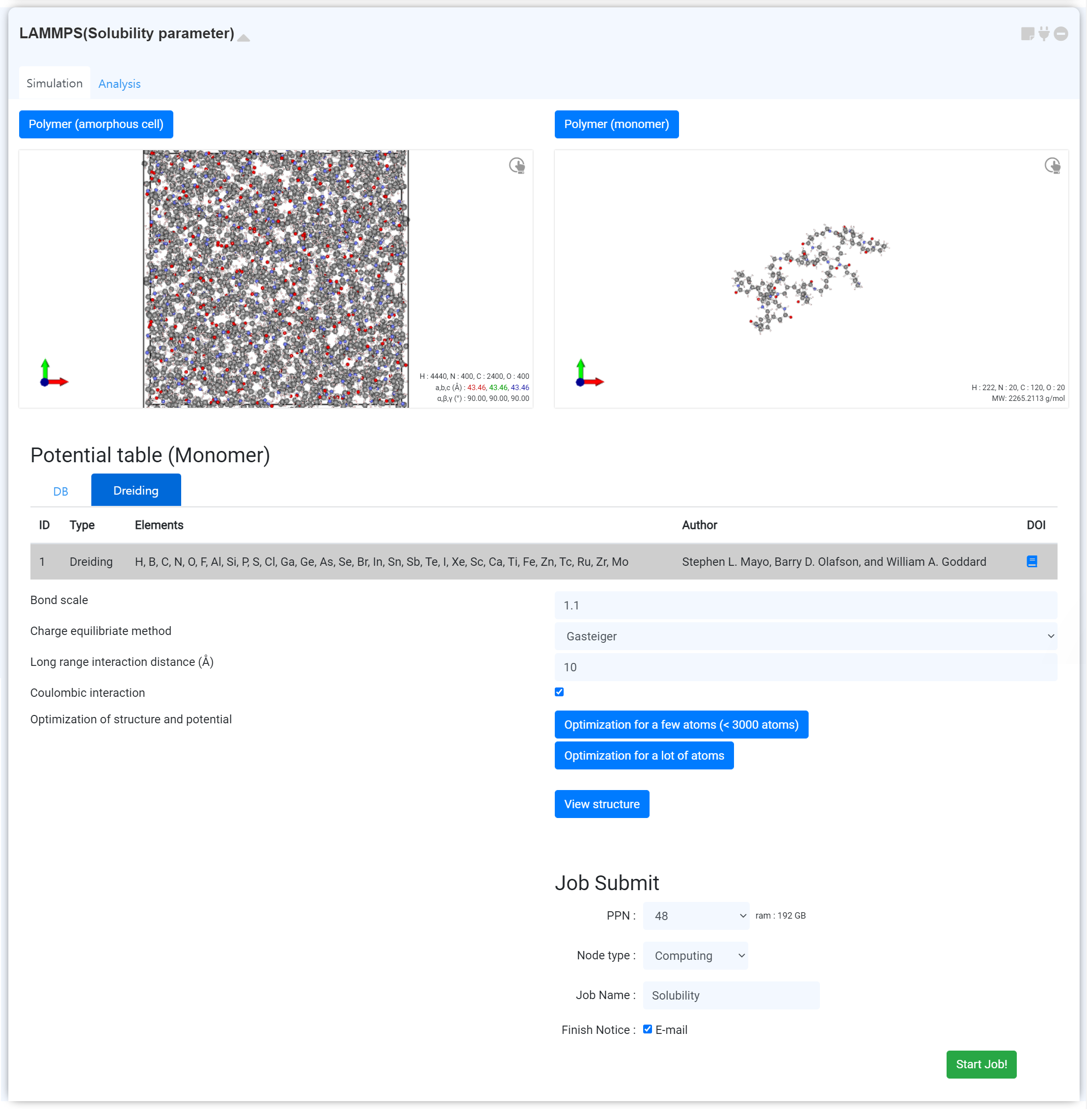 - Select the appropriate potential for the system. 'Dreiding' is the default.