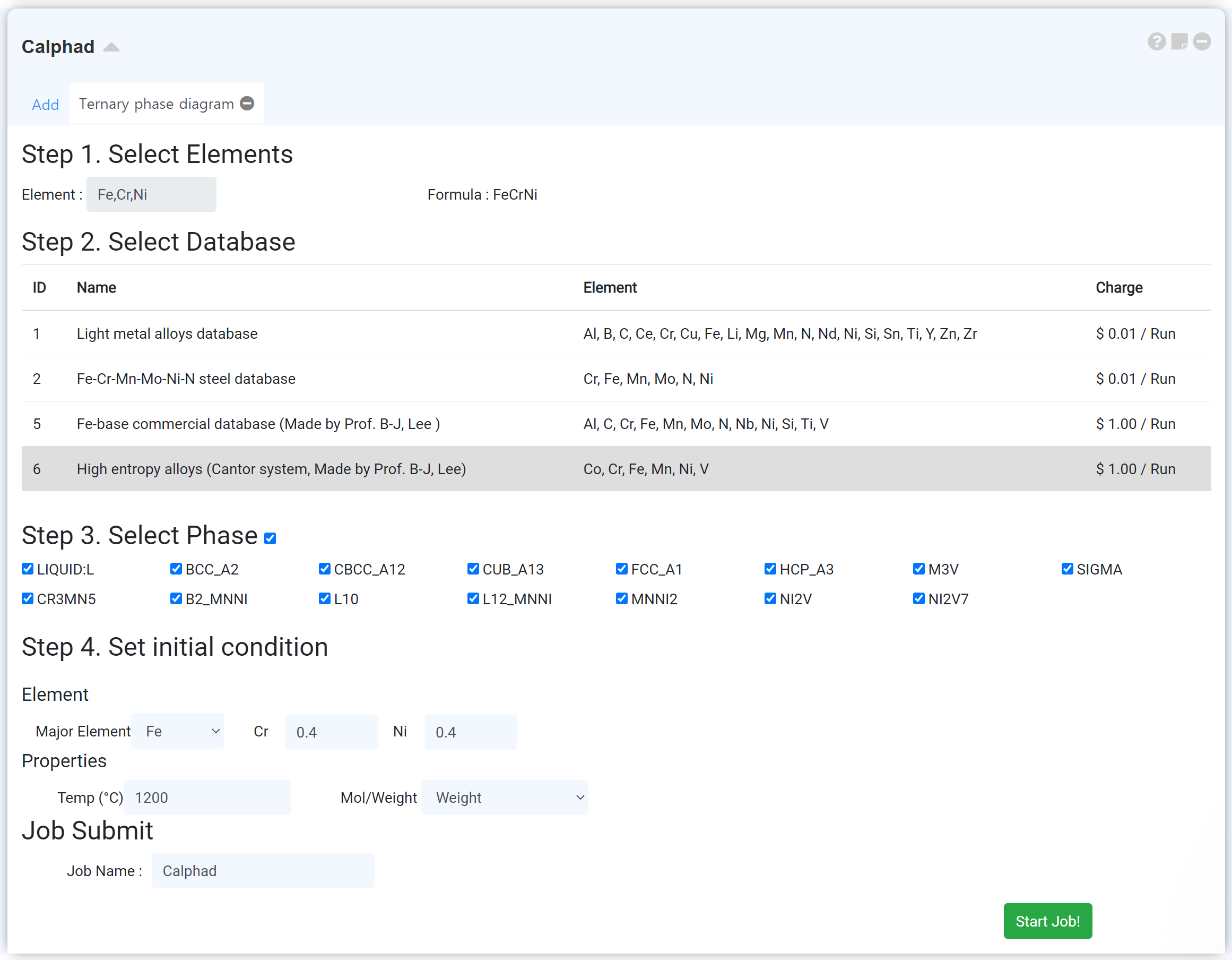 Calphad is the module calculating thermodynamic information of various materials. Refer to the