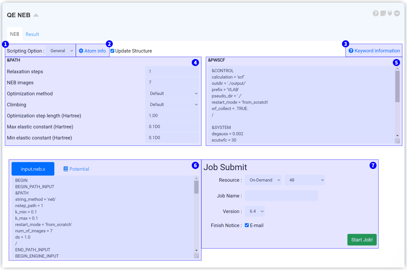 - Press the Start Job! button to run all calculations that have been added upon QE module.