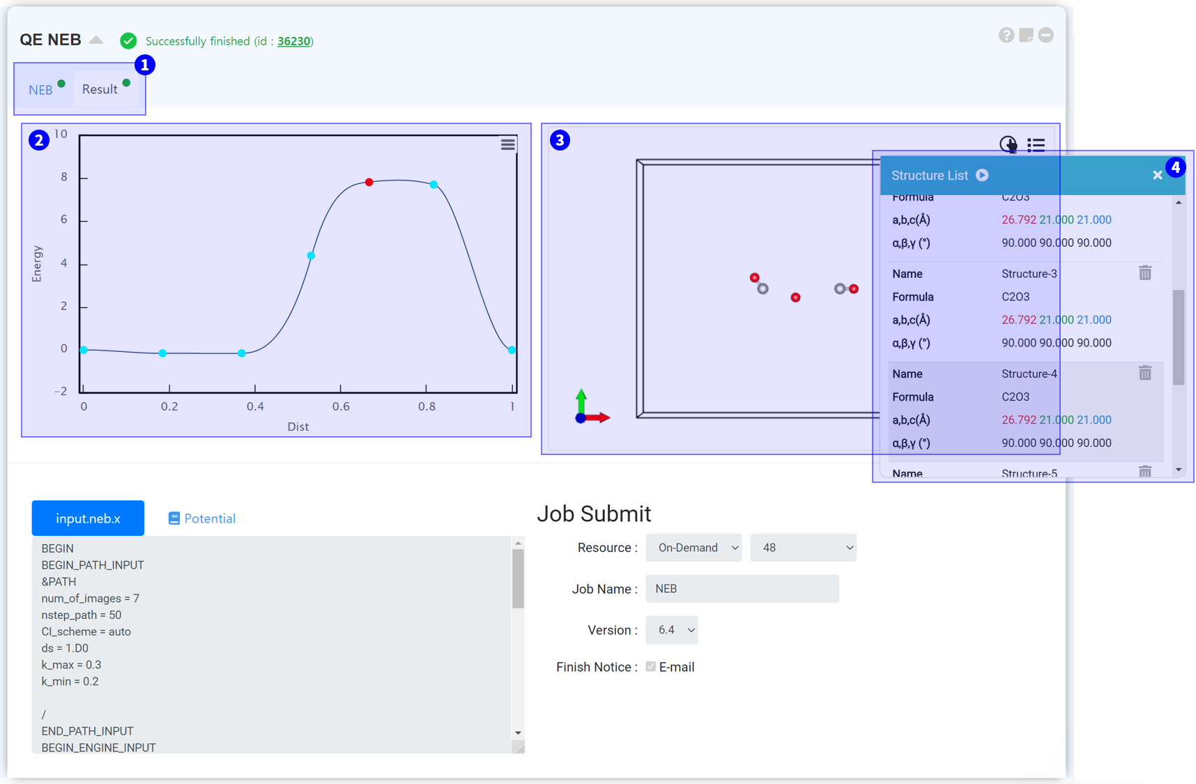 When NEB calculation is finished normally, the result tab will be displayed. Click the result tab to check the results.
