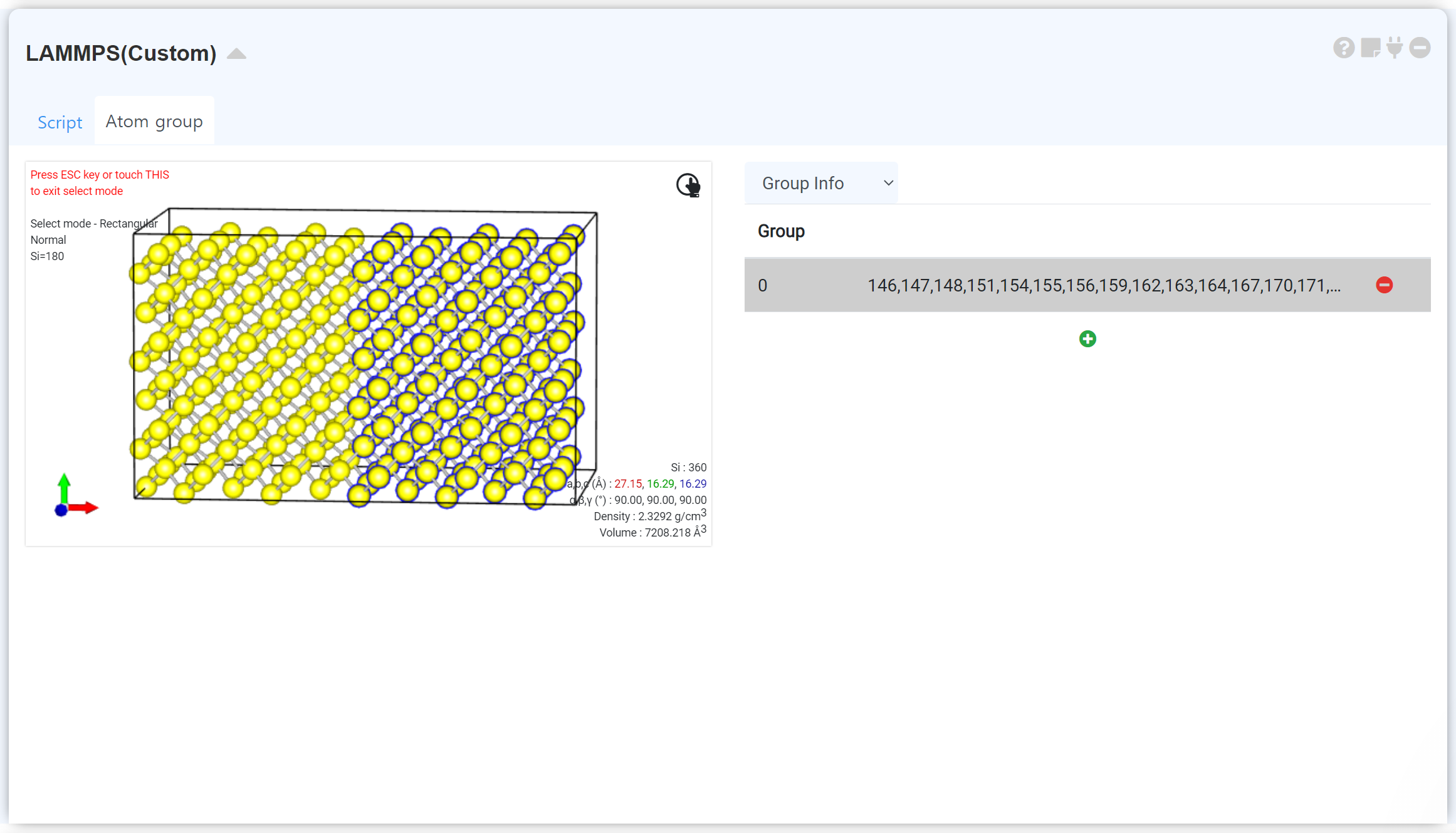 LAMMPS can give an initial condition to a specific atom group. Click the AtomGroup tab to display a visualizer. The visualizer contains the structure information when the module is connected to the structure builder. Activate a select menu at the right-click popup window, and select the atoms that you want to add the additional setting. If you click the +, the new atom group will be added.