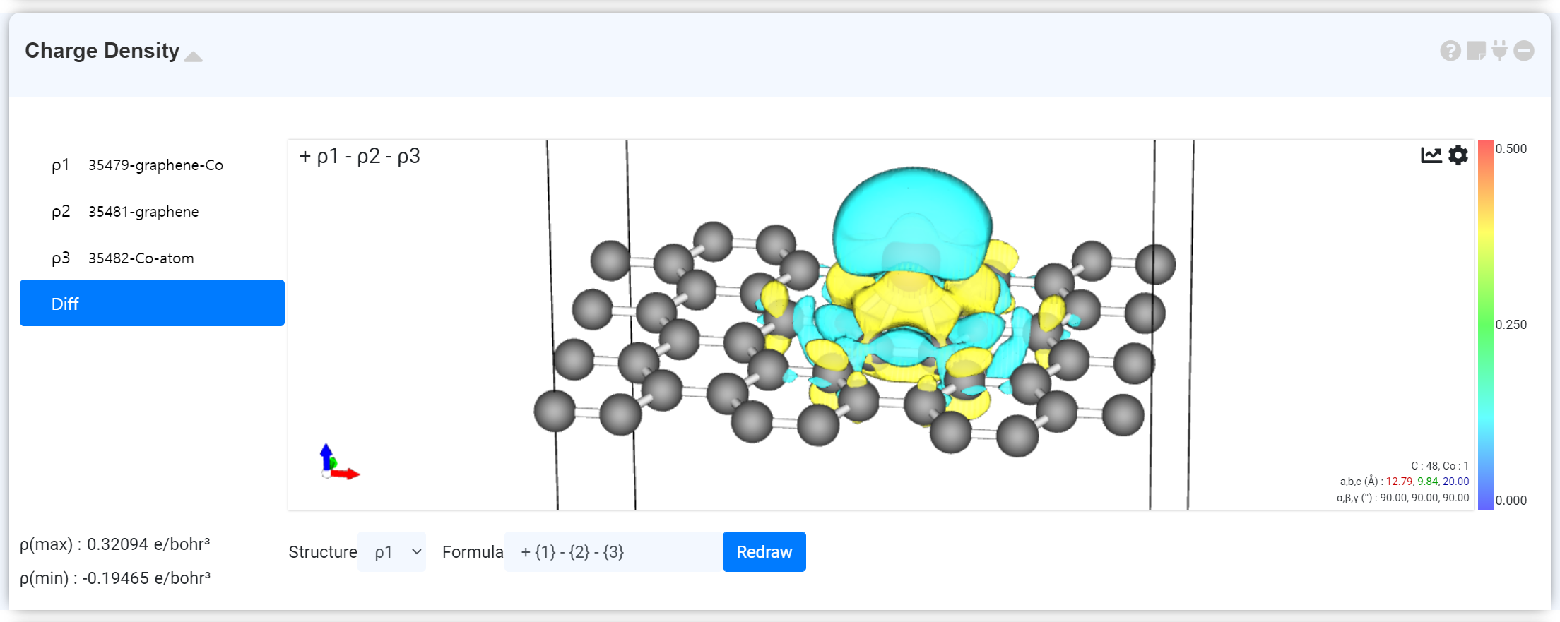 2 개 이상의 Charge density 데이터를 연결하면 Charge density differnce를 확인할 수 있습니다. 좌측의 Charge Density list에서 Diff를 클릭하면 기본적으로 ρ1 구조와 ρ1-ρ2로 계산된 Charge Density 데이터가 표시됩니다. 모듈 하단에 있는 Structure 선택을 변경하여 Visualizer에서 보일 구조를 바꿀 수 있고, Formula를 이용하여 각 값들의 차이를 구할 공식을 정할 수 있습니다. 이때 설정되어 있는 표면의 색과 반대 색을 갖는 표면은 negative 값을 갖는 charge density입니다.