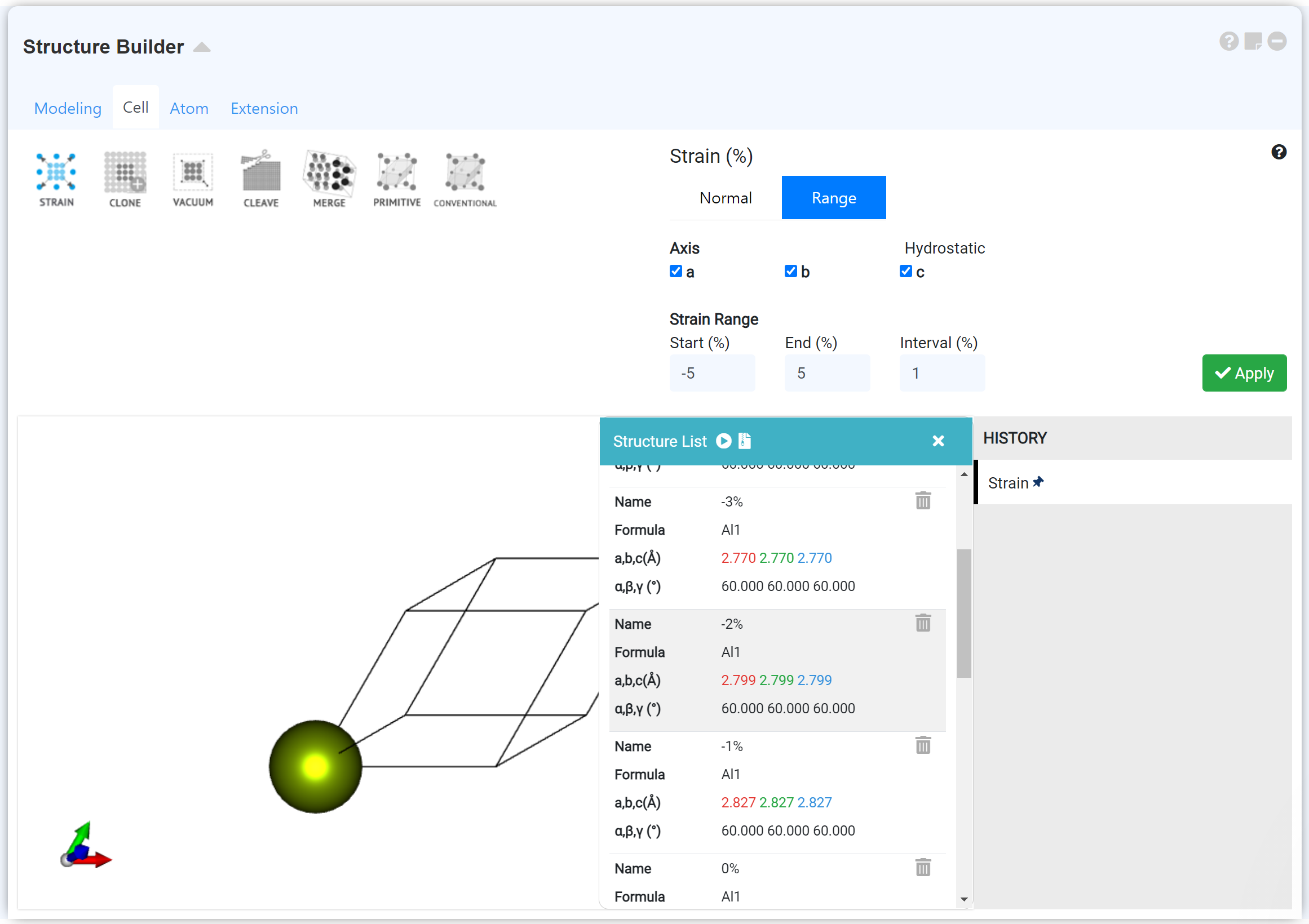 'Structure Builder' 모듈 'Cell' 탭의 'Strain (Range)' 메뉴를 이용해 부피가 변화하는 구조 세트를 모델링하여 equation of state를 계산할 수 있습니다. 자세한 내용은 Webinar - MatSQ 109: A New Paradigm of Materials Research-Machine Learning(CGCNN), [MatSQ Tip] High Throughput 모듈을 통한 Bulk Modulus 계산을 참고하십시오.
